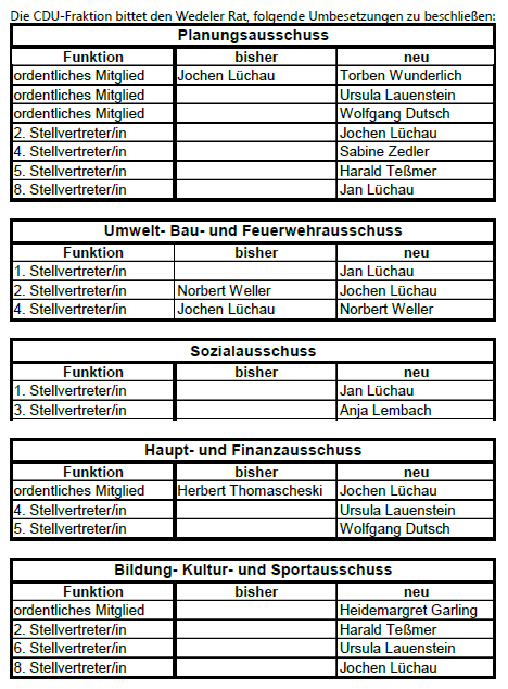 3. Der Rat der Stadt Wedel wählt Herrn Wolfgang Dutsch (CDU, Ratsherr) in den Planungsausschuss.