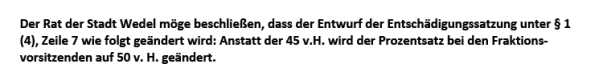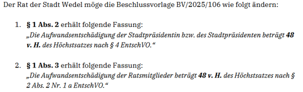 Der Rat der Stadt Wedel beschließt die in der Anlage angefügte Satzung der Stadt Wedel über die Zahlung von Entschädigungen an Ehrenbeamtinnen und Ehrenbeamte und ehrenamtlich tätige Bürgerinnen und Bürger. Die Satzung tritt am 01.01.2026 in Kraft.