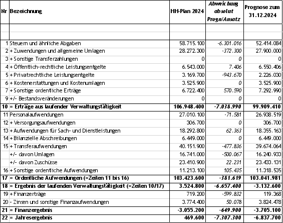 Die im folgenden genannten Zahlen der prognostizierten Ergebnisrechnung stellen den Kenntnisstand zum 31.08.2024 dar.