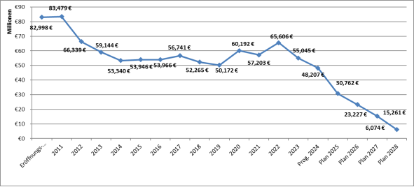 6 Mio. € liegen und ist damit nahezu aufgebraucht. Im Vergleich zur Eröffnungsbilanz entspricht dies einer Verringerung um fast 93 % (!) seit 2011.