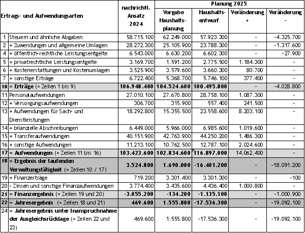 Für die Darstellung der Details der Haushaltsplanung wird im Folgenden das Finanzplanungsjahr 2025 aus dem Ursprungshaushaltsplan 2024 als Vergleichswert herangezogen.